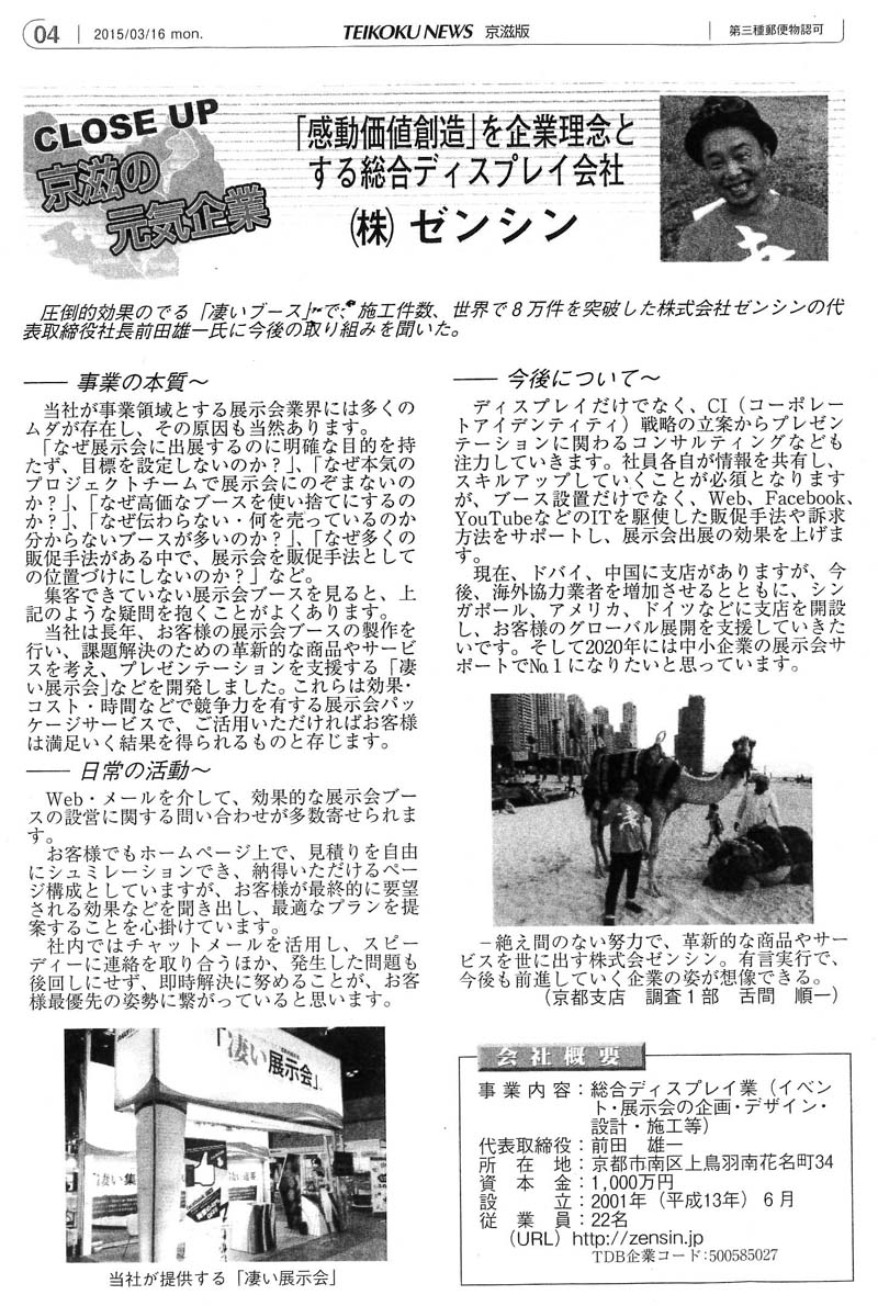 2015.03.16 TEIKOKU NEWSに掲載されました 株式会社帝国データバンク「TEIKOKU NEWS」 2015年3月16日発行号の記事で、弊社が掲載されました。 前へ お知らせ一覧へ 次へ