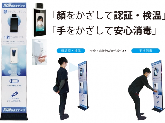 Smart checker(スマートチェッカー)とは「顔認証型サーマルカメラ」と、非接触の「自動消毒液噴霧器」を広告ディスプレイスタンドに取り付けた商品です。